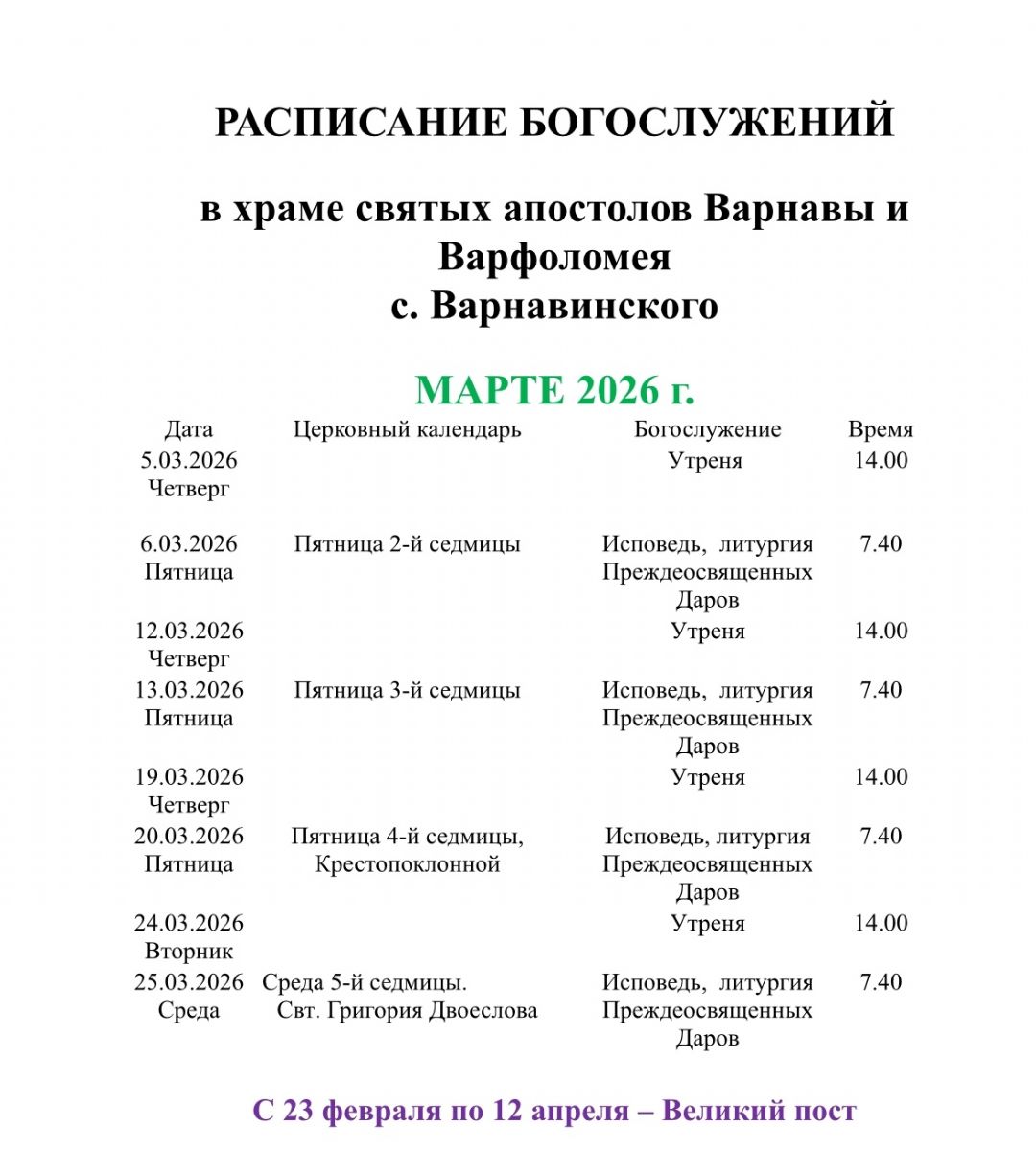 Расписание богослужений