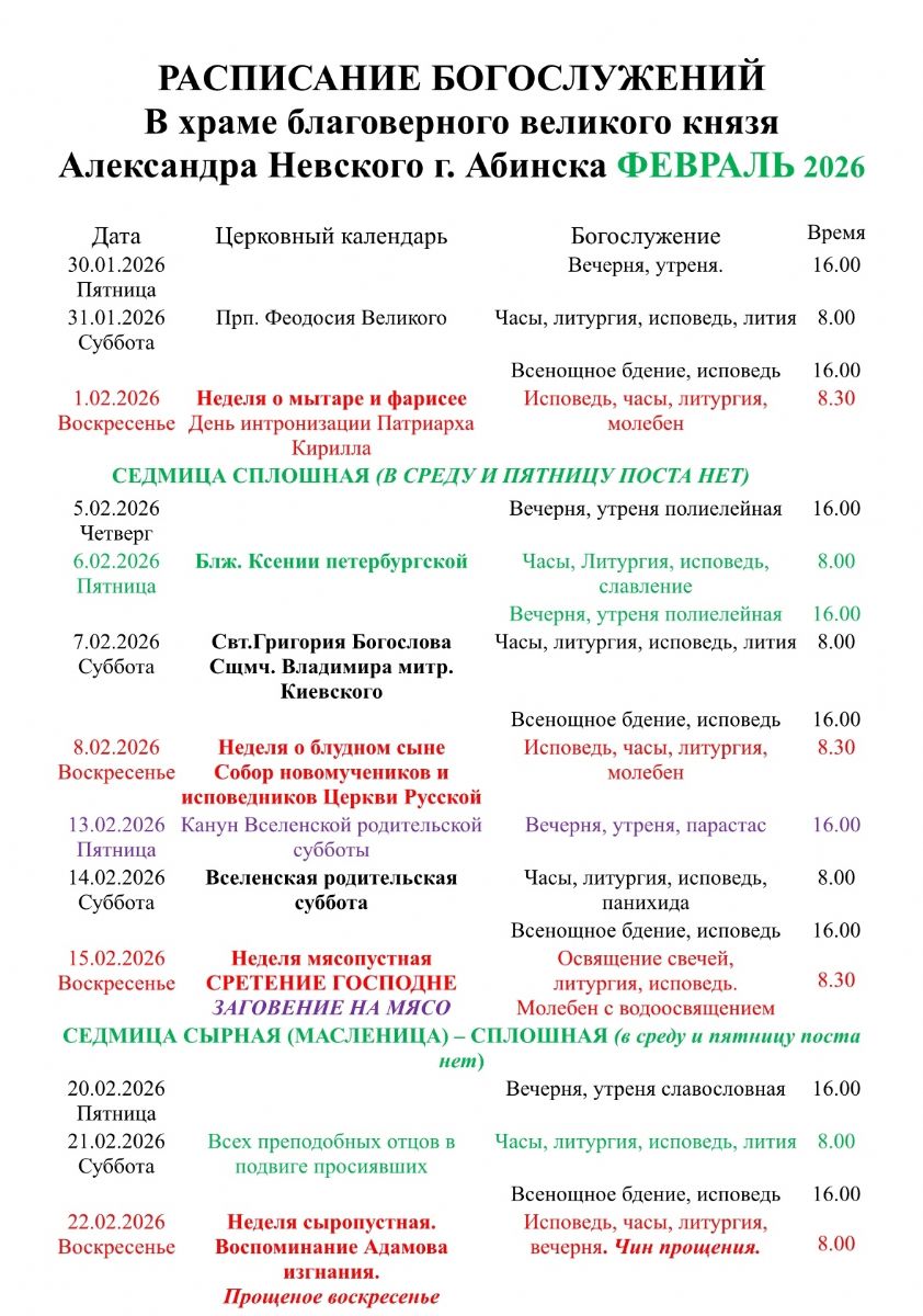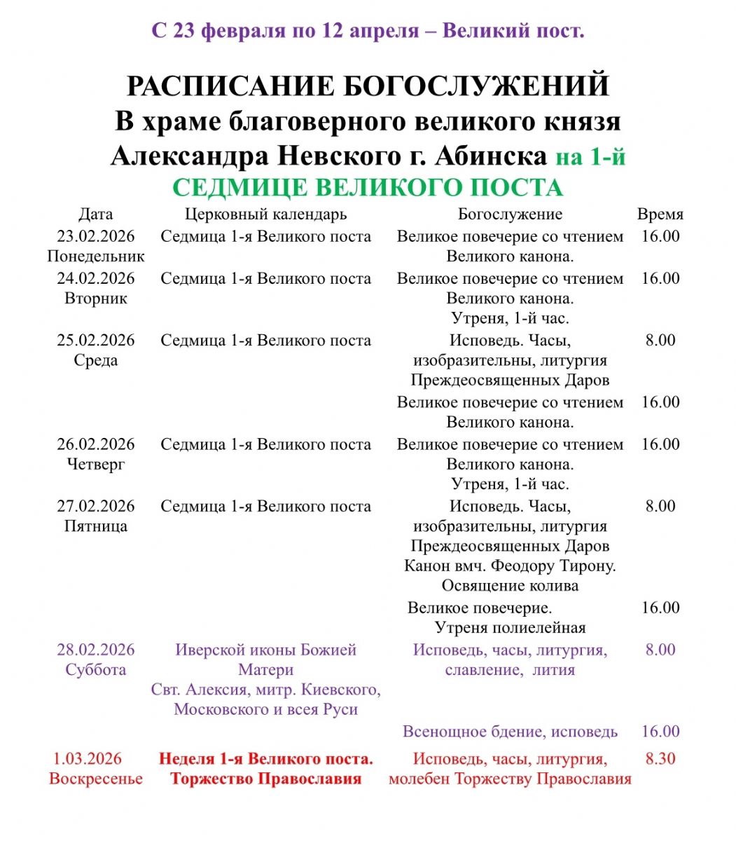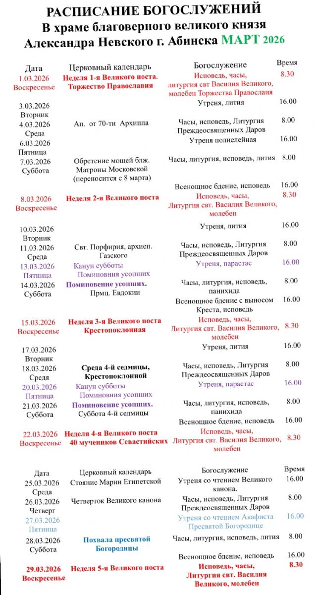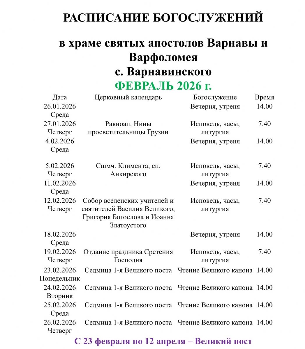 Расписание богослужений